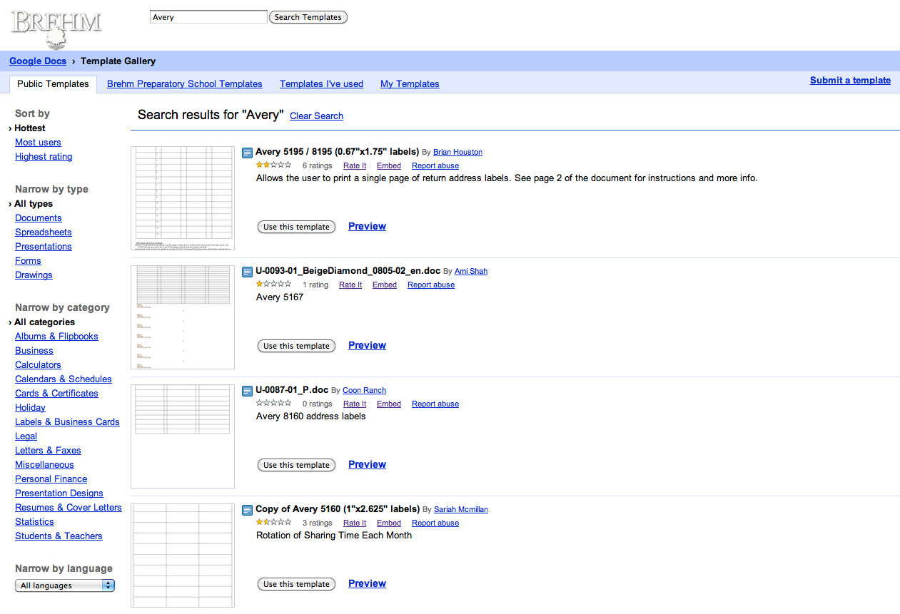Google Docs has a large online community that also shares their work with others.  A less known feature in Google Docs is Templates.  Templates are pre-formatted documents that can be added to your documents collection to do things like printing labels.