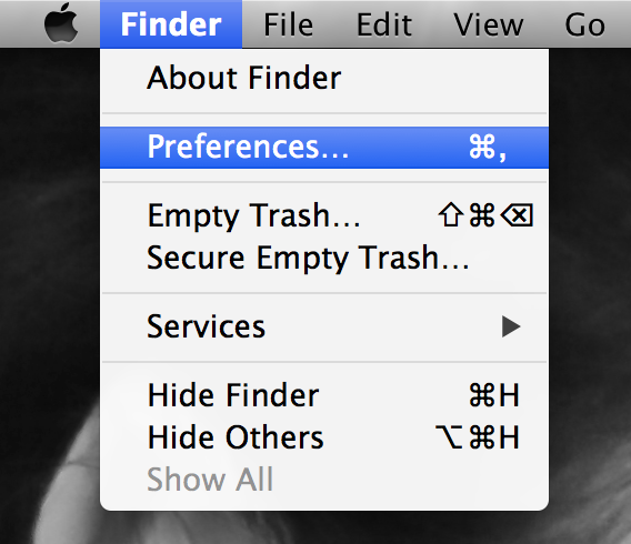 First, make sure that you are in the Finder – Then at the top of your screen, left click on the application name “Finder,” and click “Preferences.”